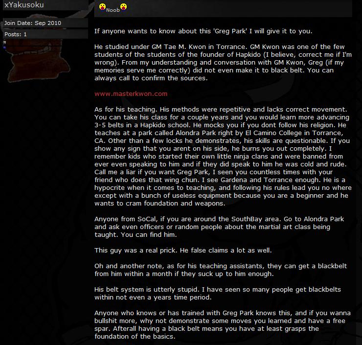 If anyone wants to know about this 'Greg Park' I will give it to you. He studied under GM Tae M. Kwon in Torrance. GM Kwon was one of the few students of the students of the founder of Hapkido (I believe, correct me if I'm wrong). From my understanding and conversation with GM Kwon, Greg (if my memories serve me correctly) did not even make it to black belt. You can always call to confirm the sources. www.masterkwon.com As for his teaching. His methods were repetitive and lacks correct movement. You can take his class for a couple years and you would learn more advancing 3-5 belts in a Hapkido school. He mocks you if you dont follow his religion. He teaches at a park called Alondra Park right by El Camino College in Torrance, CA. Other than a few locks he demonstrates, his skills are questionable. If you show any sign that you arent on his side, he burns you out completely. I remember kids who started their own little ninja clans and were banned from ever even speaking to him and if they did speak to him he was cold and rude. Call me a liar if you want Greg Park, I seen you countless times with your friend who does that wing chun. I see Gardena and Torrance enough. He is a hypocrite when it comes to teaching, and following his rules lead you no where except with a bunch of useless equipment because you are a beginner and he wants to cram foundation and weapons. Anyone from SoCal, if you are around the SouthBay area. Go to Alondra Park and ask even officers or random people about the martial art class being taught. You can find him. This guy was a real prick. He false claims a lot as well. Oh and another note, as for his teaching assistants, they can get a blackbelt from him within a month if they suck up to him enough. His belt system is utterly stupid. I have seen so many people get blackbelts within not even a years time period. Anyone who knows or has trained with Greg Park knows this, and if you wanna bullshit more, why not demonstrate some moves you learned and have a free spar. Afterall having a black belt means you have at least grasps the foundation of the basics. |