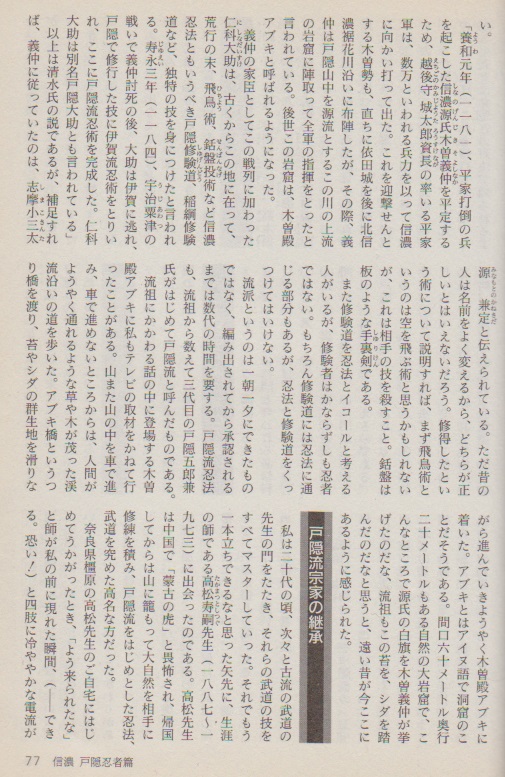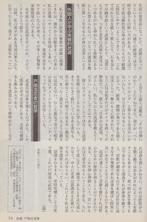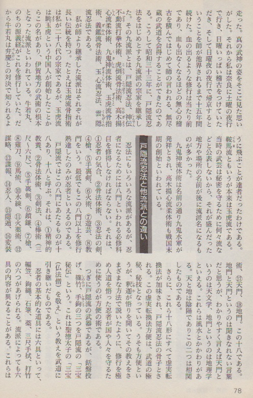 1 名前:下関 :01/10/25 13:09 ID:RYUPQa47 「秘伝」でこの人の宣伝をよく見掛けますけど、実際はどうですか?また、柳生心眼流、浅山一伝流、卜伝流などの宗家を名乗っていますが、その辺はどうですか?? 2 名前:名無しさん@お腹いっぱい。 :01/10/25 14:55 ID:iliaM3BV 武神館宗家の弟弟子らしいよ。古い出版物(宗家の)に写真で出ていたよ。 3 名前:文系@物理14点 :01/10/25 15:03 ID:9mMs+ppu なんて読むの? 4 名前:児雷也 :01/10/25 20:33 ID:vvOYYAjK 私が知っている範囲でいうと、 1.とにかく几帳面な性格で、フランクでまるで禅問答のような指導の仕方をする 初見宗家とは激しく対立し、80年代のニンジャブームの最中破門同然で武神 館を飛び出し米国にて忍法武芸道場玄武館を設立し次代宗家を襲名する。 2・秘伝での連載が終わったのは、種村宗家が出ているのを見て怒り狂った武神館 関係者の横槍があったかららしい。 3・かなり修羅場をくぐったらしく、警察官時代に多人数や麻薬中毒者を相手にし たという。 4・懇切丁寧な指導を心掛けており、どっかの団体とはえらい違いらしい。 5・幼いころから武芸を仕込まれており、特に剣術に関しては天才とまで言われて いる。 6・非常に熱心かつ貪欲な姿勢で各古流武術や中国武術を修めており、師事した師 範は数知れない。その中の一人の福原という人は高松先生の高弟であり、彼に 師事したことが種村宗家の自信をささえている。 とまあ私の知っているのはこんなところです。 検索エンジンという便利なものもありますし、ここはひとつ御自分で調べてみたら いかがでしょうか。 それと忠告しておきますが、格闘技的な強さを求めるならば武神館に入るのはやめ ておいたほうがいいです。 何せ二十年以上修行していても素人に毛が生えた連中がほとんどですから。 同じ期間中拳を修行した方が全然ましです。 5 名前:名無しさん@お腹いっぱい。 :01/10/25 22:55 ID:xaByIM93 初見よりもまだましだ。 6 名前:Echo(゚¬゚) :01/10/25 23:00 ID:4sMupBce 実は高松先生が晩年住んでいた町の高校に通ってた。 高松先生の旅館って何処にあったんだろ? 7 名前:名無しさん@お腹いっぱい。 :01/10/25 23:06 ID:4AGBB+y0 まぁ、どいつもこいつもインチキやね。静かな山で合気を修行したほうがよっぽど人間できるで。 8 名前:名無しさん@お腹いっぱい。 :01/10/26 13:23 ID:w0kaGeSI >6 奈良県のどっかにあったらしいよ。 9 名前:名無しさん@お腹いっぱい。 :01/10/26 22:49 ID:vIri2OoT 武神館の初見さんと玄武館の種村さんは、 どんな理由で仲違いしたのかな? 10 名前:Echo(゚¬゚) :01/10/26 23:05 ID:DSWQl3Vk >>8 奈良県橿原市のどっからしいですね。 橿原は古い旅館も多いから、いつも通ってた所だったりして。 11 名前:名無しさん@お腹いっぱい。 :01/10/26 23:07 ID:vIri2OoT >>8 旅館? 食堂経営じゃなかったかな? 12 名前:Echo(゚¬゚) :01/10/26 23:09 ID:DSWQl3Vk >>11 そうなんですか?たしか板垣さんの本には旅館って 書いて有りましたよ。どうなんでしょう? 13 名前:名無しさん@お腹いっぱい。 :01/10/26 23:11 ID:8nXJlQTg 初見先生の本にも旅館、とありました。 14 名前:名無しさん@お腹いっぱい。 :01/10/28 14:08 ID:ZzV70vYP 昔、初見先生の本で「いま忍者」ってエッセイをよんだことあるけど、 煙に巻くような話ばかりで(つまりなにを言いたいのかわからんってこと) 好感がもてなかった。ビデオもなんかアドリブっぽく 参考にならなかった。 それに対して種村先生の本は見たことないけど(あるのかな?)、 ビデオはちゃんと説明してくれてて、内容的にもレベルが高く、 人柄が伺えた。こういう先生に習いたいもんです。 15 名前:名無しさん@お腹いっぱい。 :01/10/28 16:35 ID:xB+tFez8 警察あがりで現場経験者だから適当なことを言いたくないんでしょうね。 道統は初見さんの方が正当なのかもしれないけど直ぐに役立つことを教えて くれて使えるようにすることを念頭に置いた指導をするのは種村さんの 方だという印象がありますね。 初見さんはとにかく自分以外の人間は煙に撒くことが最善だと考えていると 公言しているので弟子も大変じゃないですか? 16 名前:名無しさん@お腹いっぱい。 :01/10/28 19:58 ID:ncyo8gpL >>14 そうかな。 いま忍者の復刻版面白く読ませてもらったけど。 ま、人それぞれだよね。読後感想は。 それより、最近になって戸隠流忍法入門とか半棒術の解説書が土屋書店から復刻 されてるけど、ちゃんと種村氏のことまだ載ってるし、モデルにも使ってる。 初見さんって方はやはりできたかたなんだなぁって思うよ。 種村氏も警察官ってことは、公務員なんだし忍法教えても金取とるわけにいかな いから大変だよね。食ってくの。 そういえば格闘マガジンKって雑誌で初見さんがいま、情報化時代でなんにもわ かってないやつに知ったかぶりして叩かれるって笑ってたけど、いま忍者はさす がだね。 ライカのカメラだけじゃなくて2chもちゃんとチェックしてるんだから。 17 名前:名無しさん@お腹いっぱい。 :01/10/28 21:43 ID:RKZUm95s >>15 >道統は初見さんの方が正当なのかもしれないけど