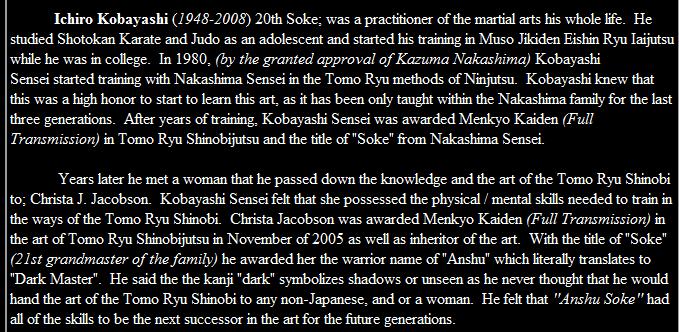 Tomo ryu or Budo ryu question Anshu Christa Jacobson - Budo Ryu http://www.bullshido.net/forums/showthread.php?t=59108 "ok hers what i know.....i have known. christa for a long time . yes she did use to be a man. (as a matter of fact, she was a groomsman in my wedding and i have the pictures to prove it). my problem isnt that, its all the ninjitsu bs she spins on her site. she claims to be a master in ninjitsu but shes only been actually training in ninjitsuy since 2003. she started in kenpo and got her black belt from me and steve crawford. im in the process of researching a invetigating this whole thing. as far for myself...phrost can vouch that i'm a decent guy and not on some vengence kick " |