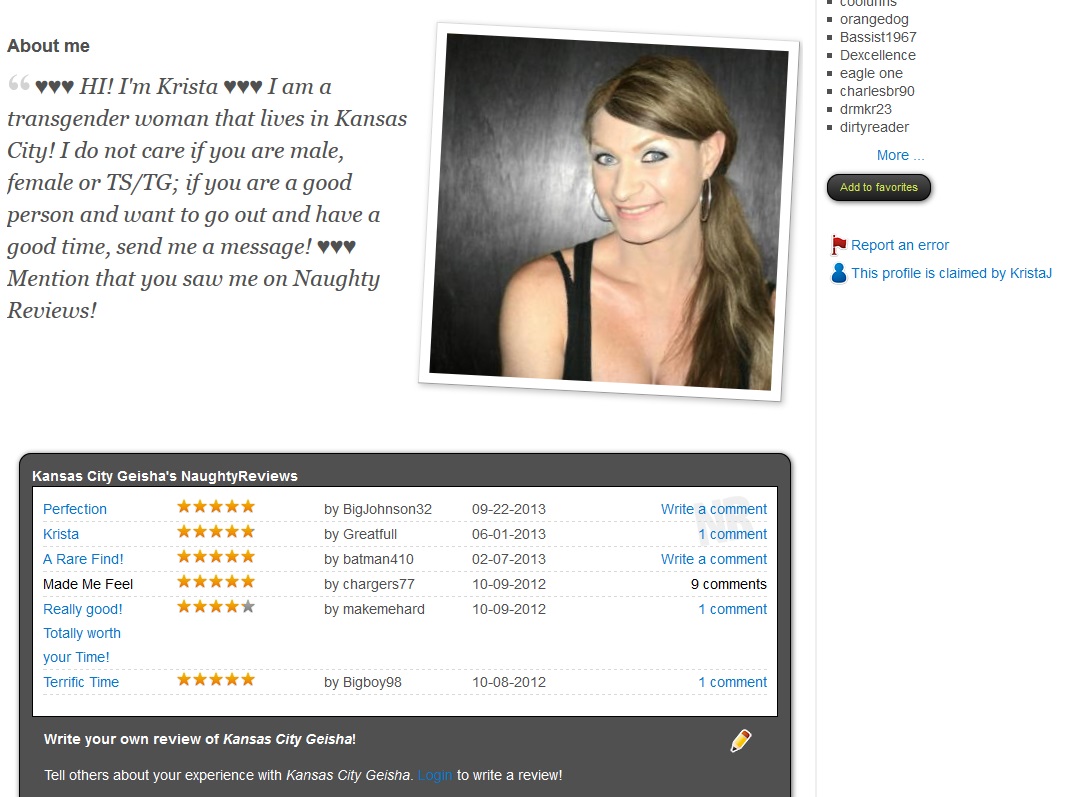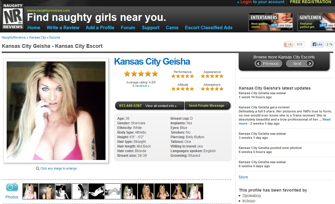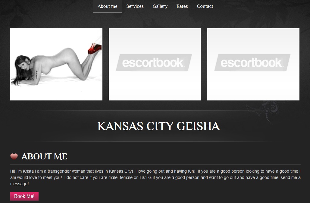 Budo ryu Grandmaster Krista as Kansas city Geisha "If you are a good person looking to have a good time I am would love to meet you!" Services Anal Sex, Clinic Sex, 69, Role-play, etc.... Price 1 hour 100USD Customer reviews here, but you need to get an account to read. http://www.naughtyreviews.com/escorts/kansas-city-geisha-kansas-city-white-shemale