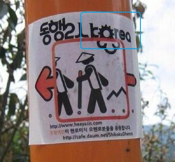 This is Pilgrimage route guide sticker in Hangul, pasted everywhere in Shikoku without permission. (The sticker says "Korea" though Shikoku is Japan)